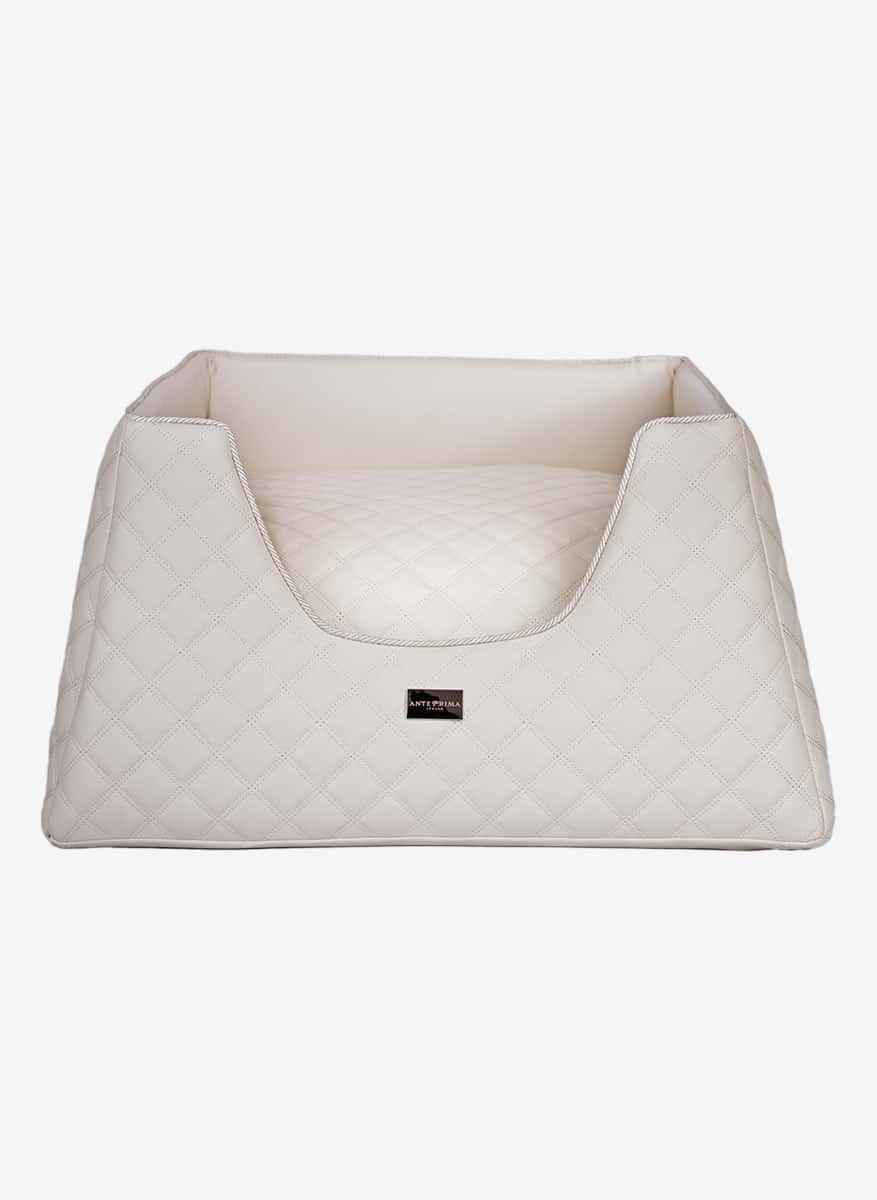 This faux leather dog bed showcases the finest eco leather with a diamond quilted pattern, ensuring both elegance and structural integrity. Its careful selection reflects not only value but also durability, offering enduring comfort for your cherished companion. Crafted with meticulous attention to detail, this bed represents more than just a functional accessory; it embodies a commitment to luxury and sophistication. Adorned with the prestigious „AntePrima“ label, each piece is a testament to Italian craftsmanship, imbued with a sense of authenticity and tradition. Beyond its aesthetic appeal, this bed prioritizes practicality, boasting a removable cover for easy maintenance. The interior, luxuriously lined with 100% cotton, ensures a cozy and hygienic resting environment for your pet. This exquisite fabric, chosen for its purity and strength, guarantees both comfort and longevity. With its perfect fusion of luxury materials and thoughtful design, this luxury dog bed stands as an essential element for discerning pet owners seeking the utmost in quality and sophistication for their furry companions, without compromising on convenience or style in their living space.