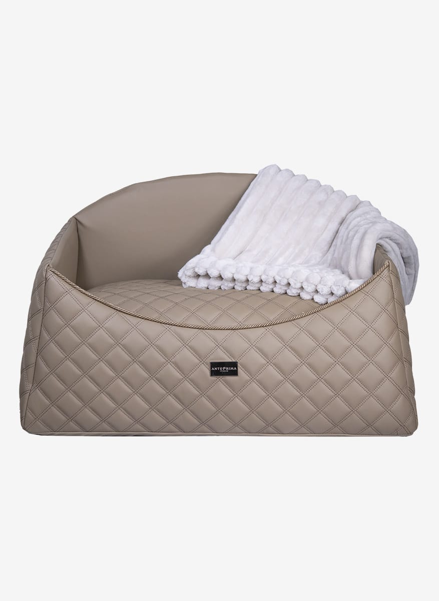 This faux leather dog bed showcases the finest eco leather with a diamond quilted pattern, ensuring both elegance and structural integrity. Its careful selection reflects not only value but also durability, offering enduring comfort for your cherished companion. Crafted with meticulous attention to detail, this bed represents more than just a functional accessory; it embodies a commitment to luxury and sophistication. Adorned with the prestigious « AntePrima » label, each piece is a testament to Italian craftsmanship, imbued with a sense of authenticity and tradition. Beyond its aesthetic appeal, this bed prioritizes practicality, boasting a removable cover for easy maintenance. The interior, luxuriously lined with 100% cotton, ensures a cozy and hygienic resting environment for your pet. This exquisite fabric, chosen for its purity and strength, guarantees both comfort and longevity. With its perfect fusion of luxury materials and thoughtful design, this luxury dog bed stands as an essential element for discerning pet owners seeking the utmost in quality and sophistication for their furry companions, without compromising on convenience or style in their living space.